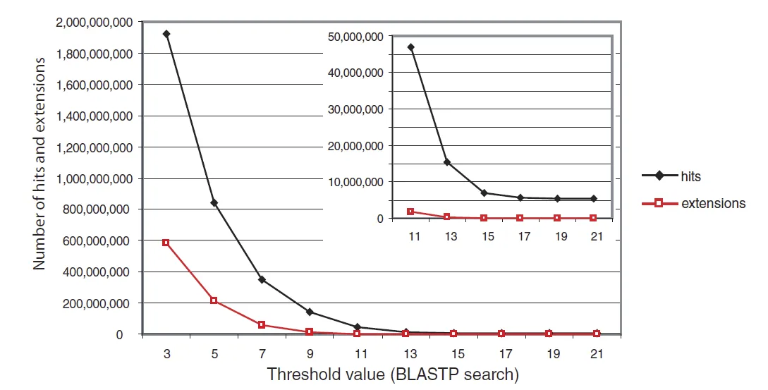 A continuació es demostrar l’efecte de diferents nivells de llindar en una cerca BLASTP canviant el paràmetre T del seu valor predeterminat (11) a un rang d’altres valors en una consulta de betaglobina humana: