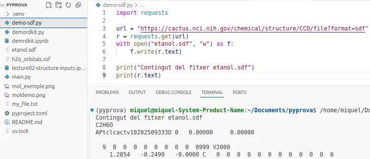 uv add rdkitPer automatitzar la tasca, executa aquest programa, que es baixarà alguns fitxers sdf únicament en cas que no els hagis baixat abans (♻️ mesura sostenible ♻️) amb la llibreria nativa os