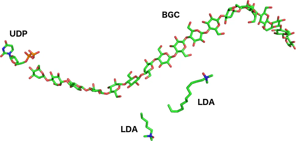 Aquí, BGC és β-D-glucosa, UDP és uridina difosfat, i LDA és òxid de lauril dimetilamina-n. Cal notar que hi ha diversos residus BGC enllaçats junts, formant un oligosacàrid d’una sola cadena. També cal notar que els àtoms d’hidrogen s’ometen d’aquesta entrada PDB. Això és perquè la resolució de raigs X ha de ser molt alta (per sota d’1Å) per veure els àtoms d’hidrogen.