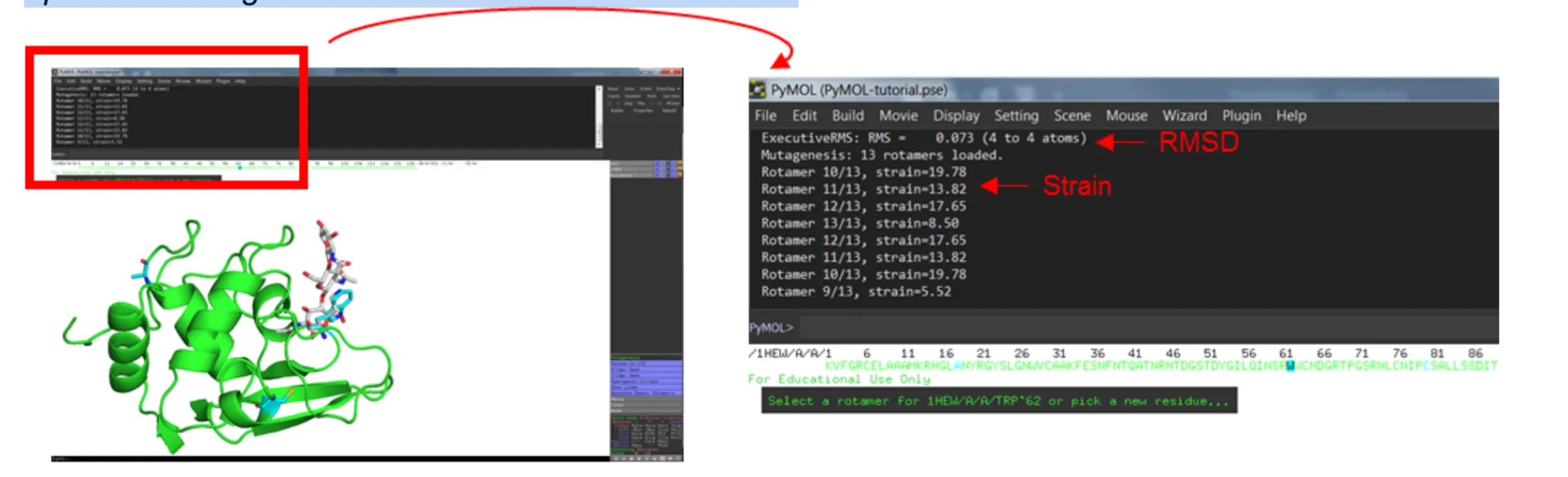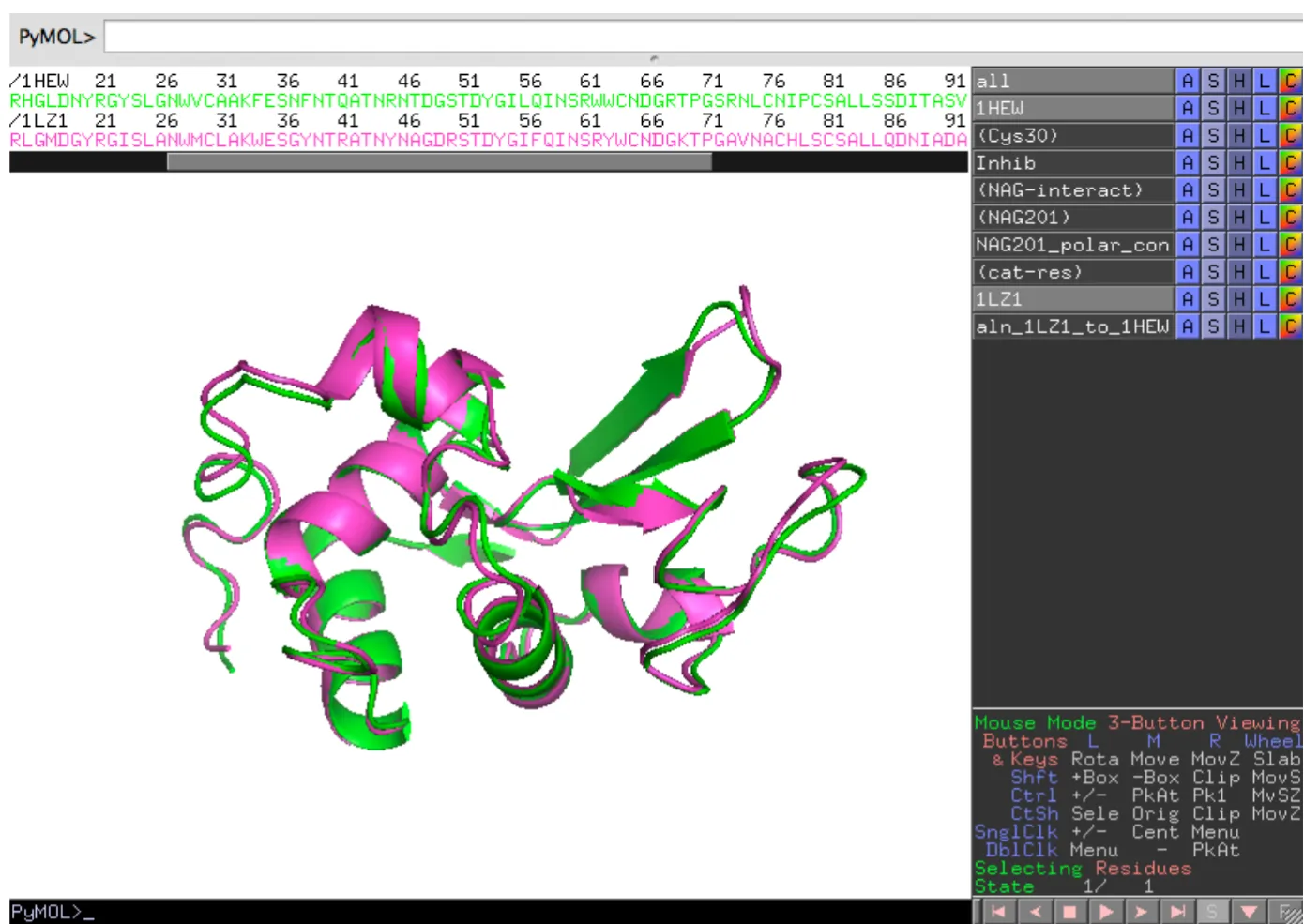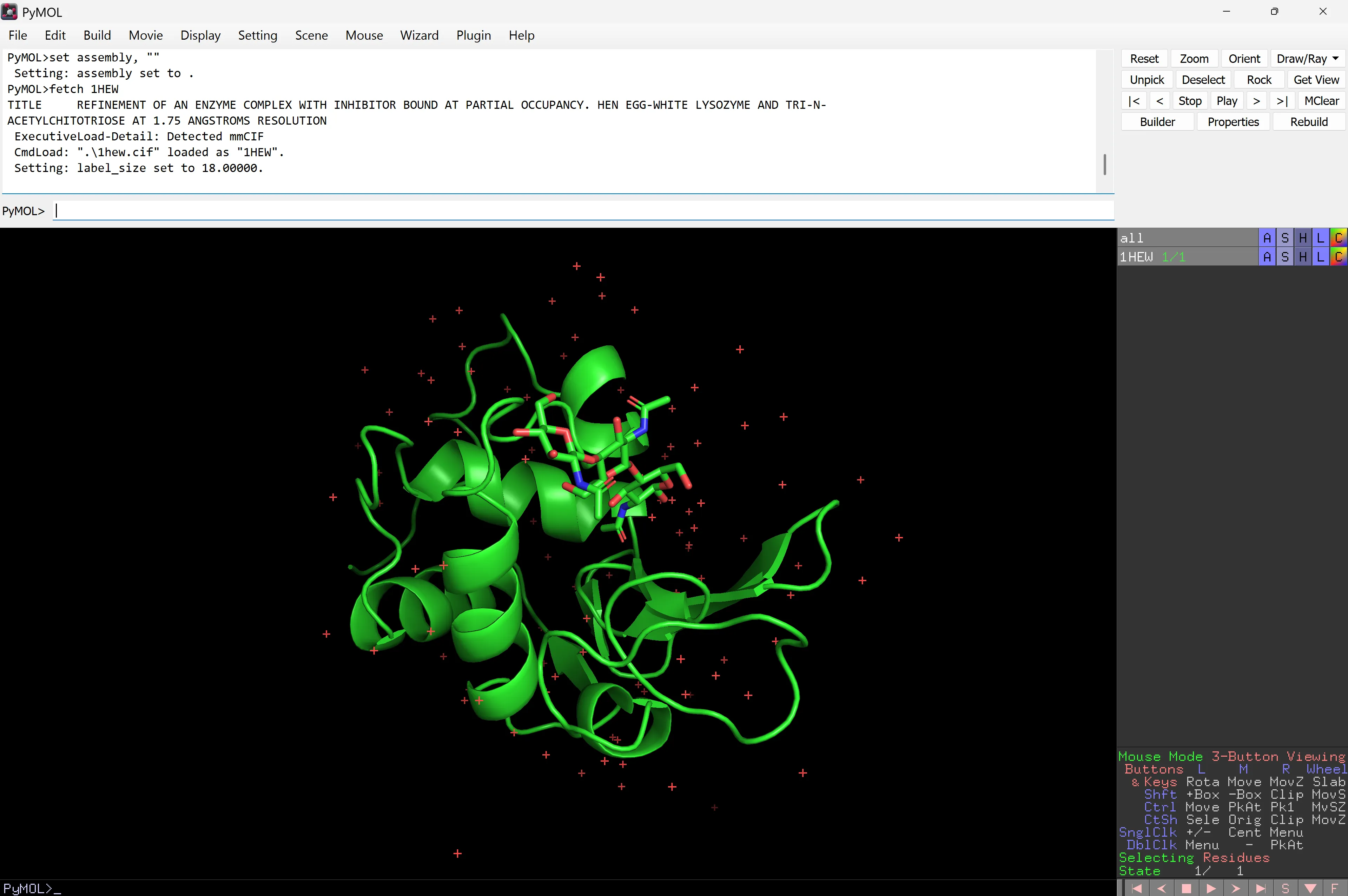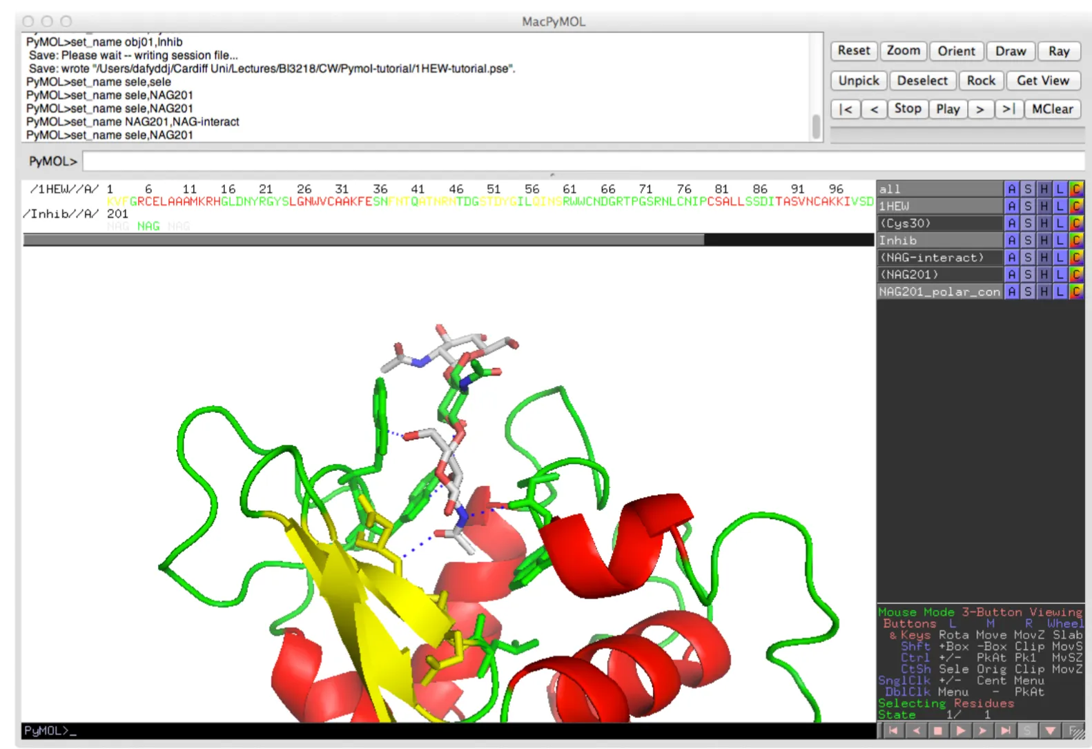 You will start learning about PyMOL by looking at the enzyme Hen Egg lysozyme in complex with the trisaccharide inhibitor tri-(N-acetylglucosamine) or tri-NAG).