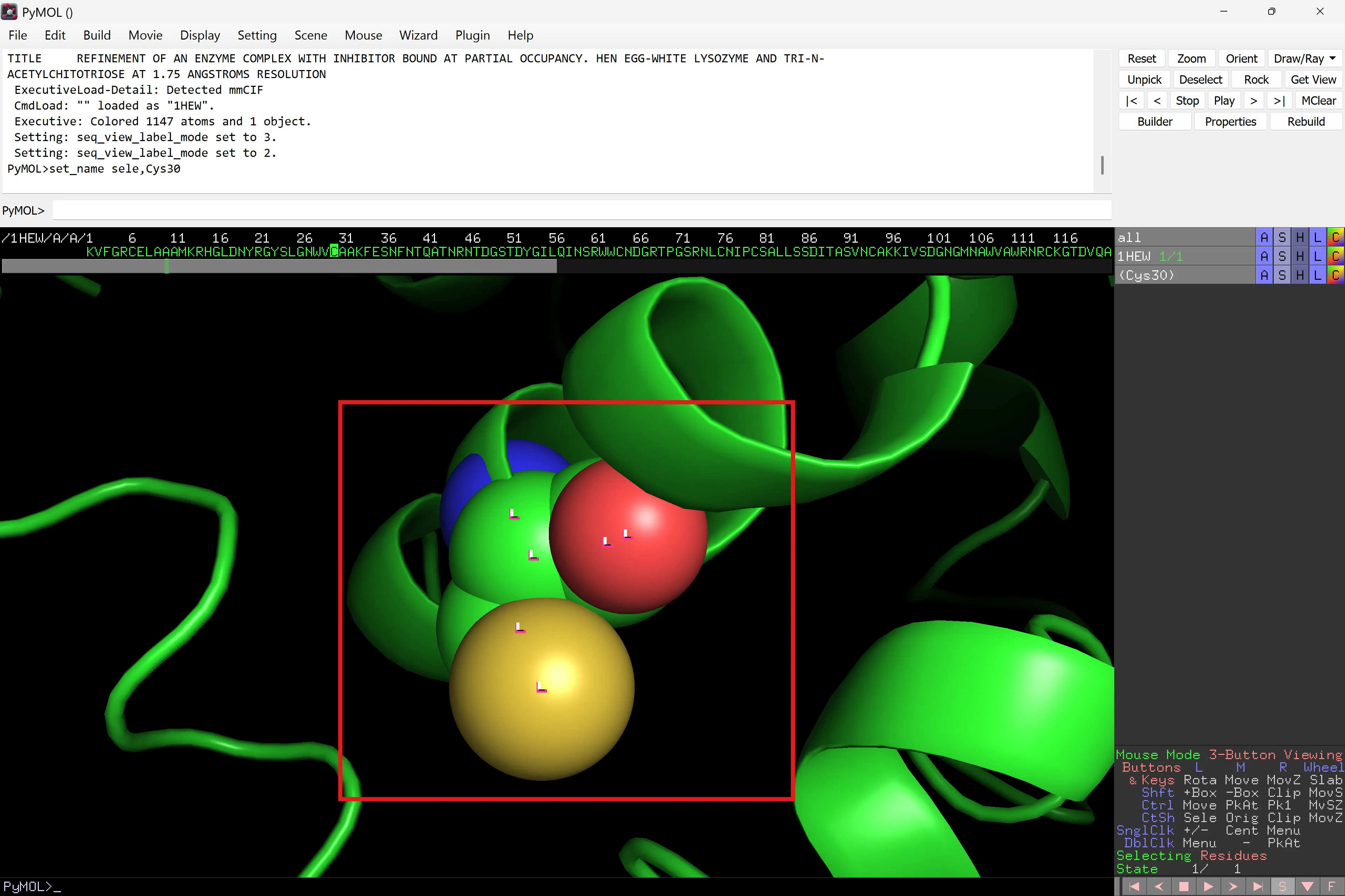 Per veure només el residu Cys30, amaga la representació cartoon de 1HEW (1HEW ‘H’ > cartoon). Només hauries de veure Cys30.