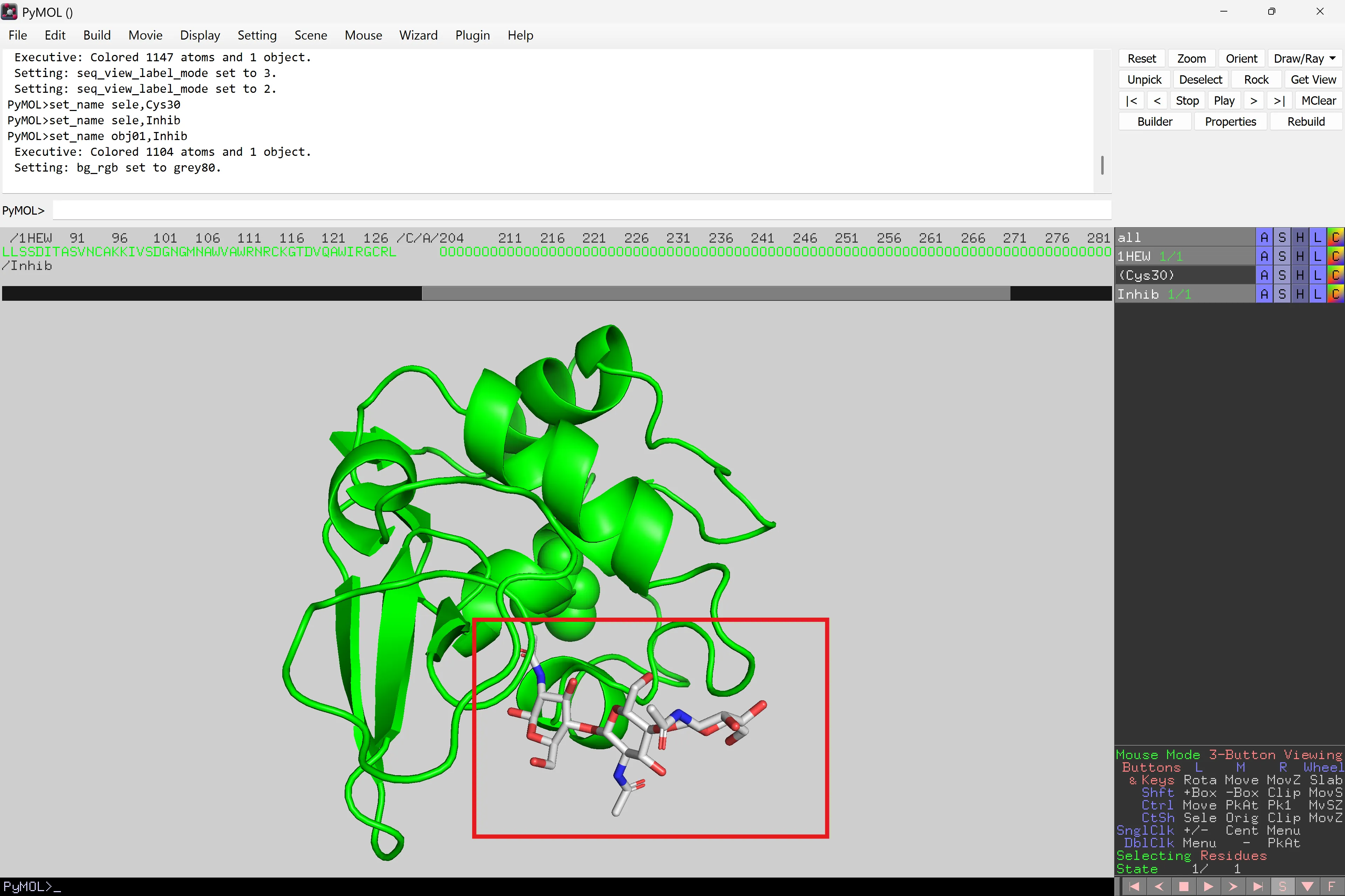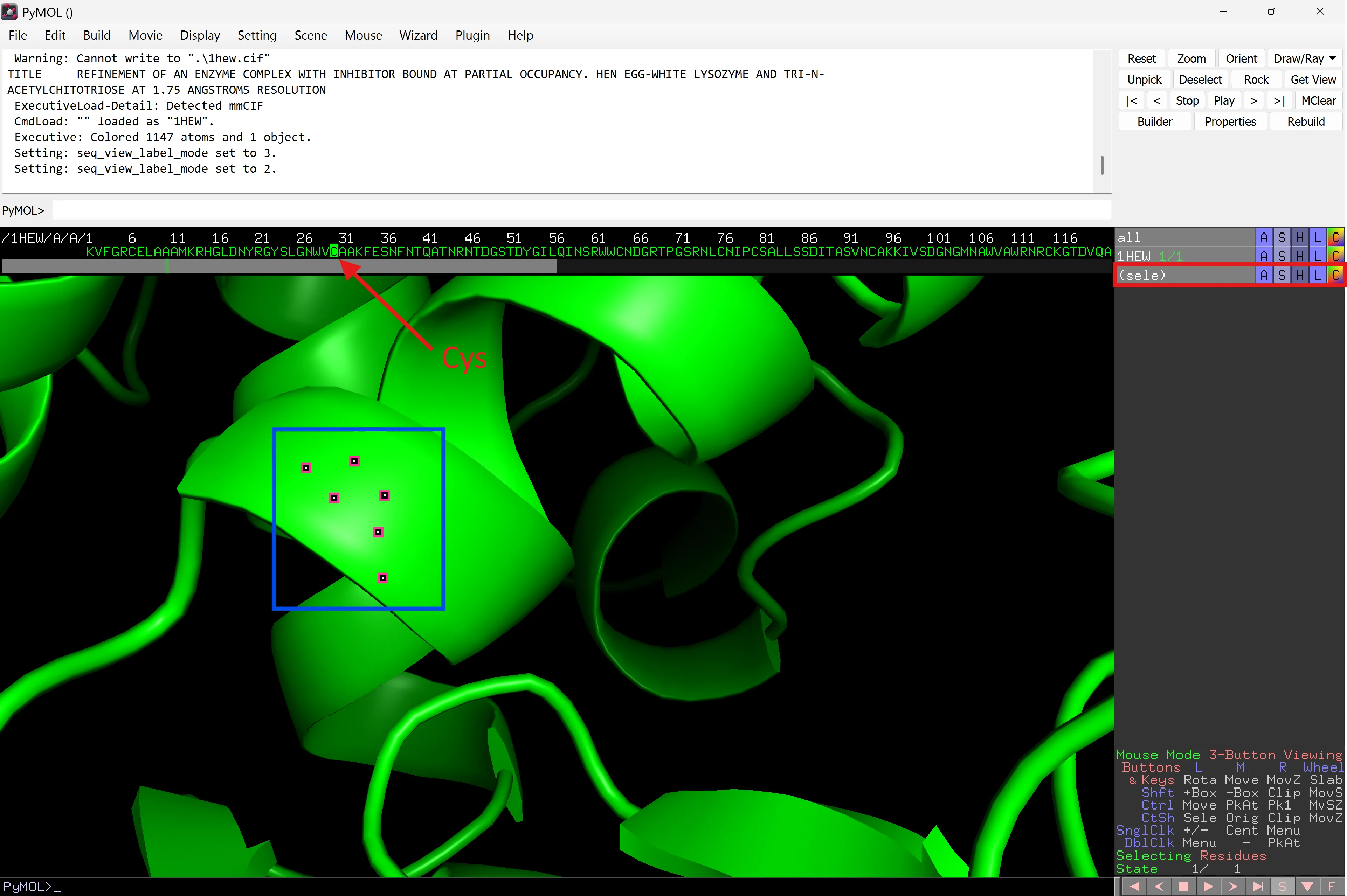 Desactiva la pestanya Cys30 – això és important perquè si no qualsevol selecció addicional s’afegirà a aquest panell. Practica seleccionant residus i canviant el nom predeterminat (sele).
