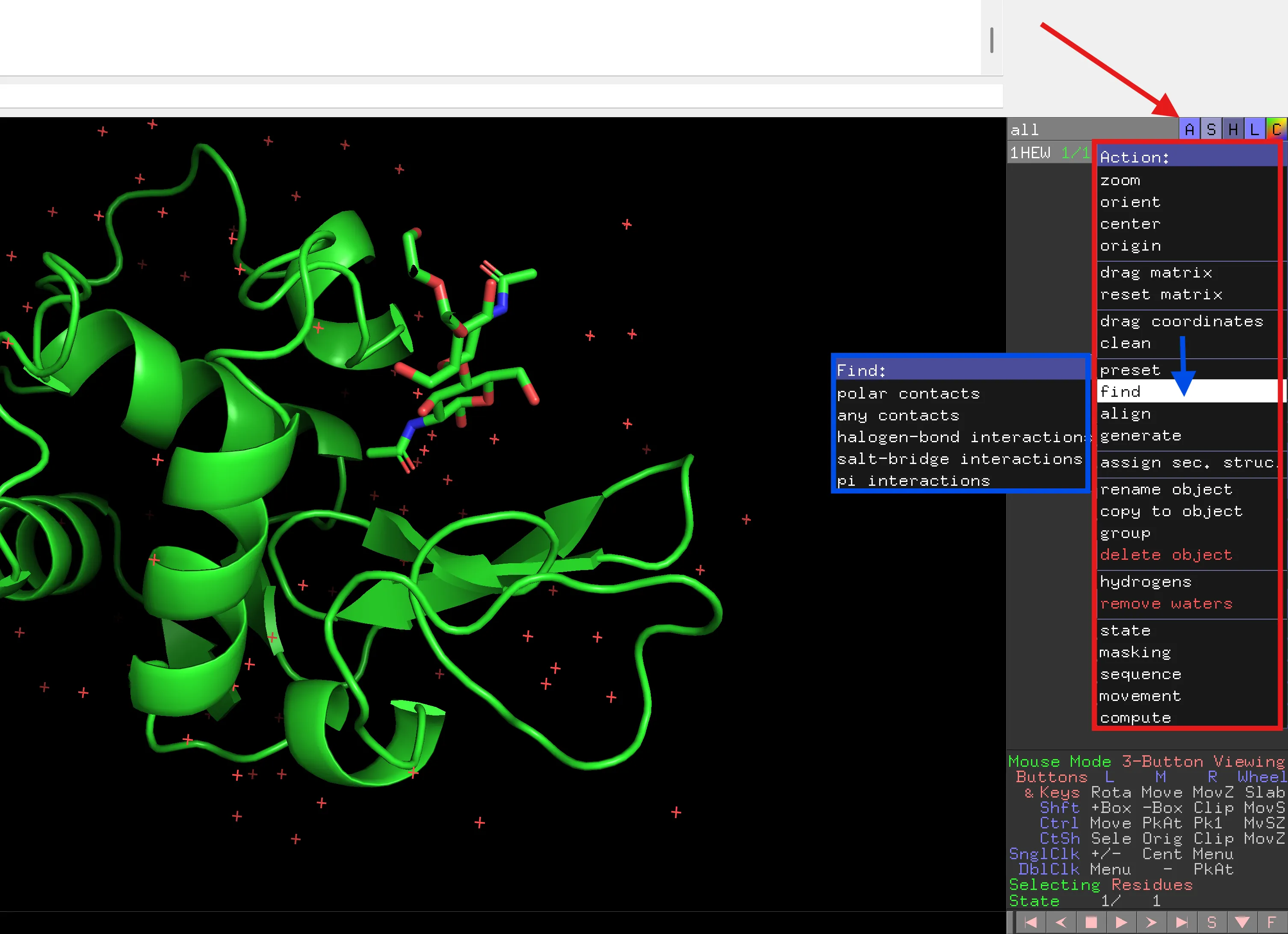- Hide the spheres for His64: (His64) ‘H’ > spheres.