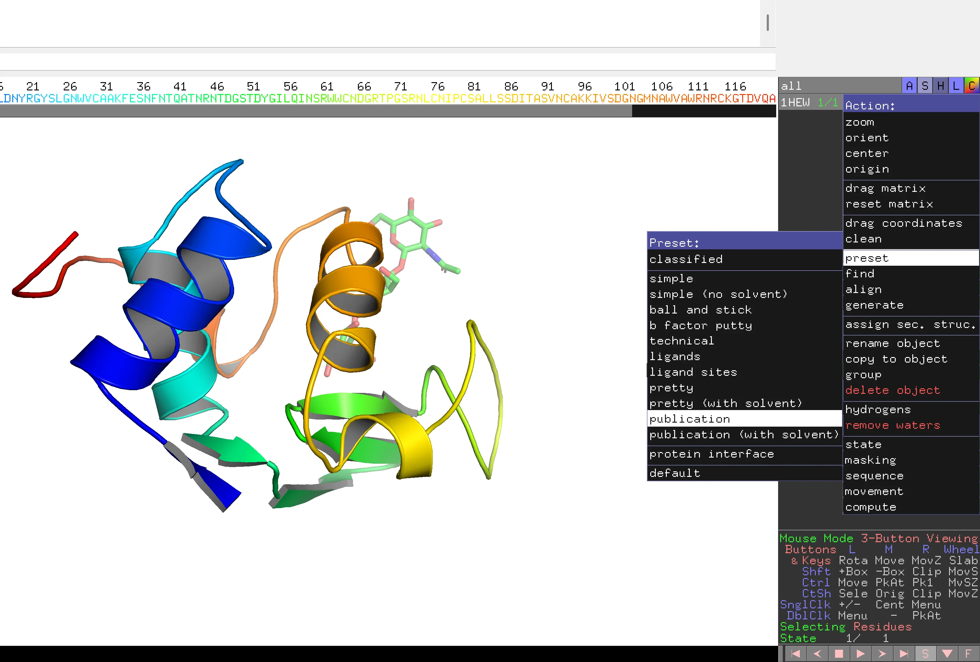 - Select the entire helix by dragging across its residues in the sequence panel, creating a new (sele).