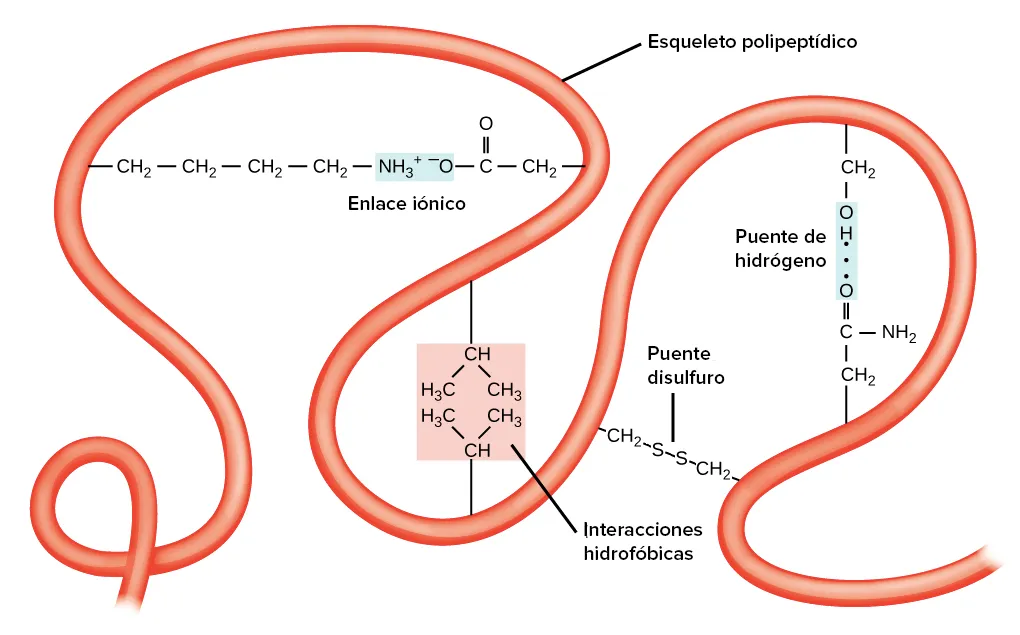 Aquests inclouen interaccions hidrofòbiques, enllaços iònics, ponts d’hidrogen i formació de ponts disulfur:
