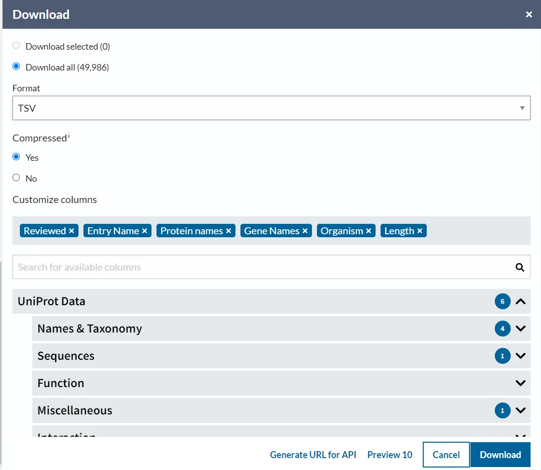 url = f"https://rest.uniprot.org/uniprotkb/search?{parametrs}&size=500"