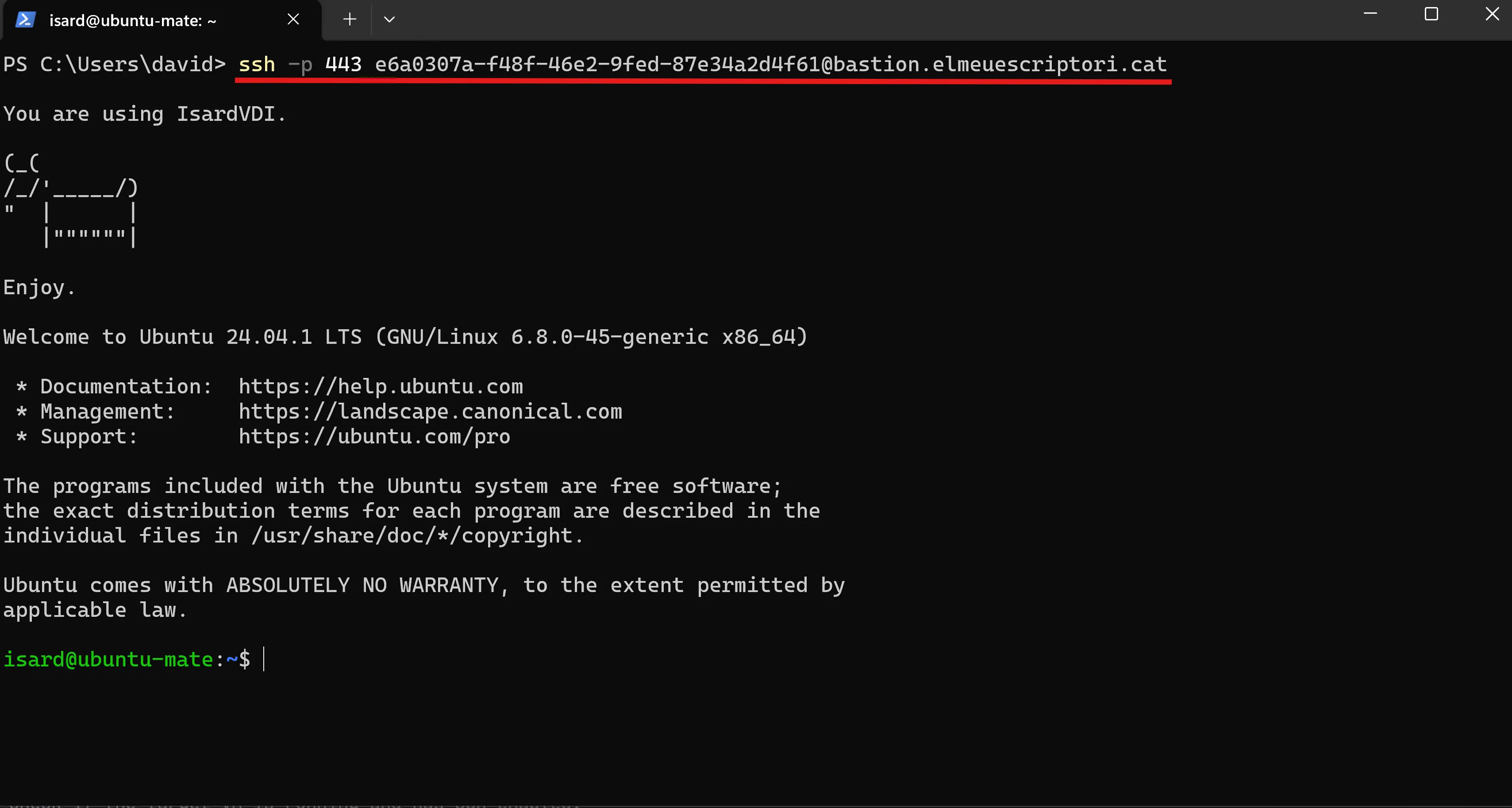 PS C:\Users\david> gc .\.ssh\id_ed25519.pubssh-ed25519 AAAAC3NzaC1lZDI1NTE5AAAAIFJgYeQKuRlSp6BOSaVriPqJ5IKakDpHLfP4csIN8Ft/ david@eliteI que faig amb aquest ID e6a0307a-f48f-46e2-9fed-87e34a2d4f61? 😒