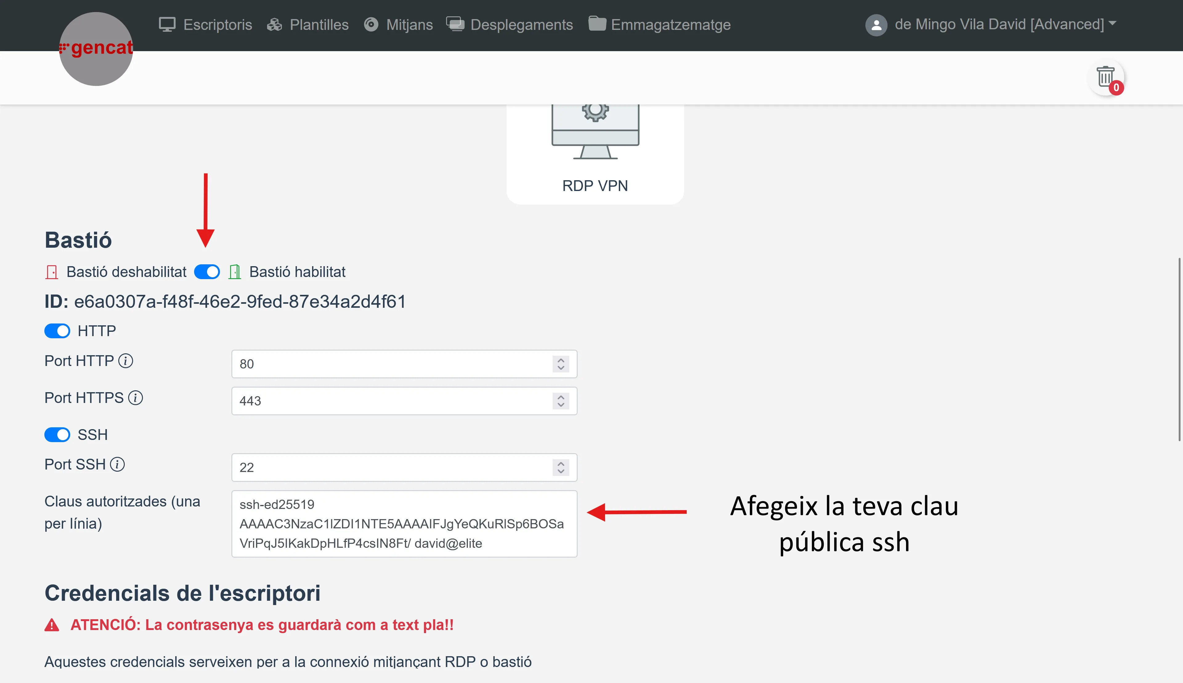 En l’apartat principal d’escriptoris, pots accedir al botó de bastion per veure el UUID juntament amb els URL per als protocols activats: