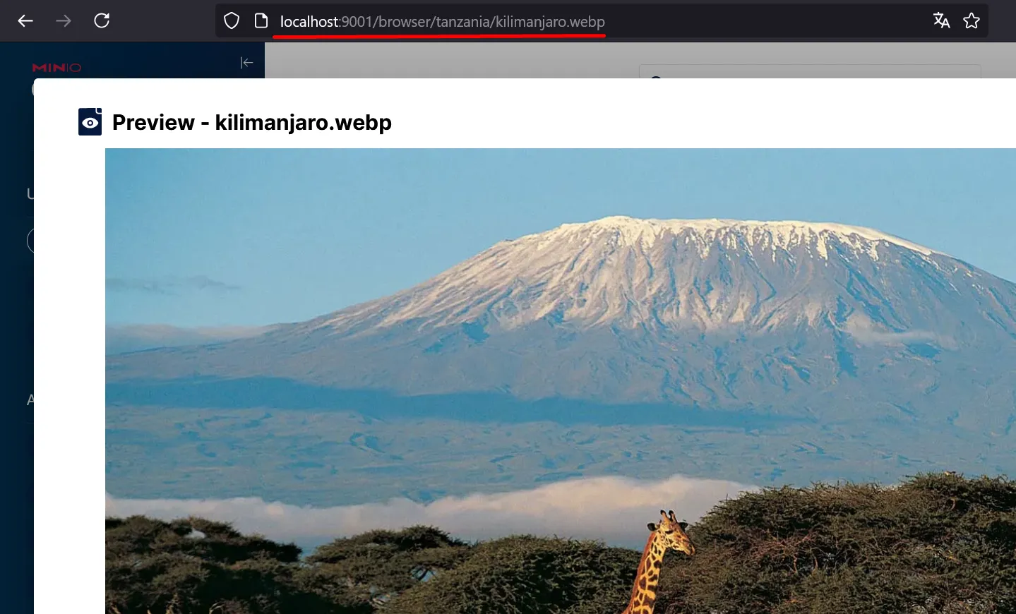 > mc cp .\serengeti.jpg local/tanzania...oads\serengeti.jpg: 101.80 KiB / 101.80 KiB [==============================================================] 1.69 MiB/s 0sPSVes a la consola, entra al bucket i previsualitza (“preview”) la imatge.