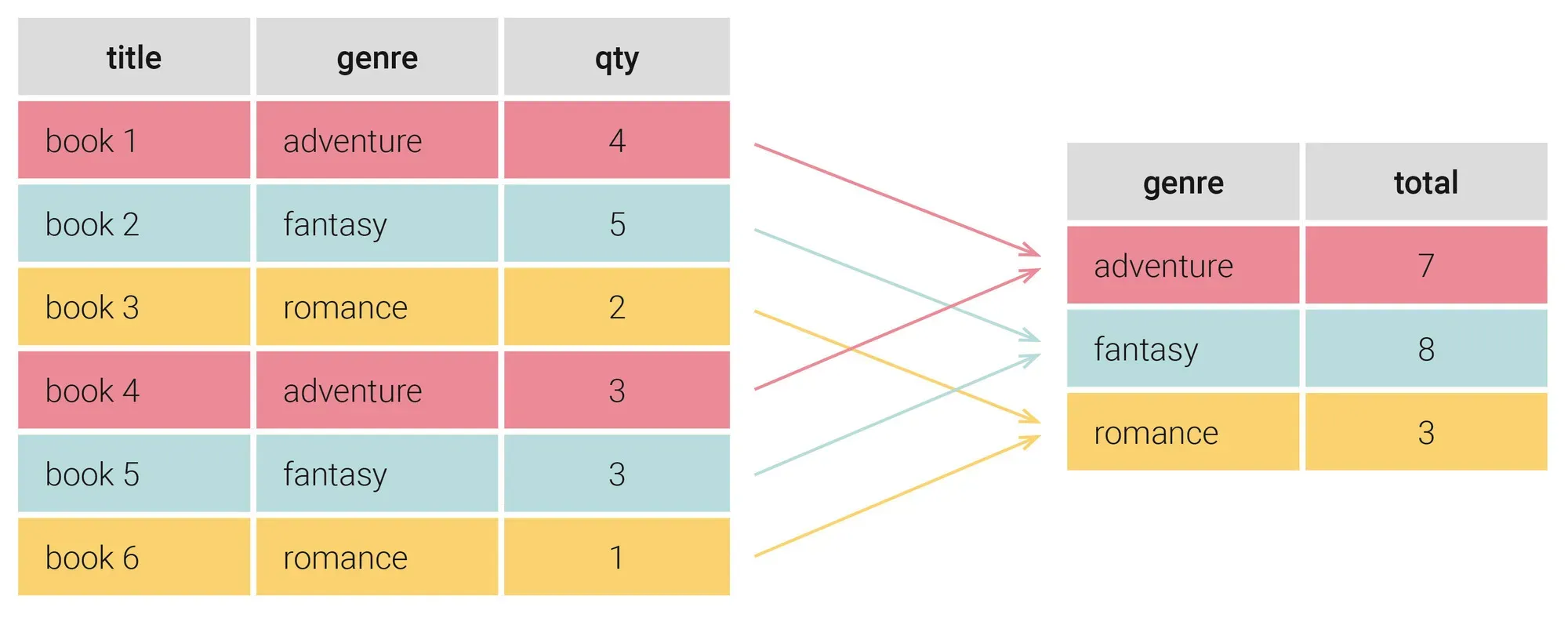 The visualization below shows how the GROUP BY clause creates groups from table data. We want to know the total quantity of books for each genre; thus, GROUP BY groups the books of the same genre and sums up the corresponding quantities. This creates a result table that lists genres and their total quantity of books in our stock.