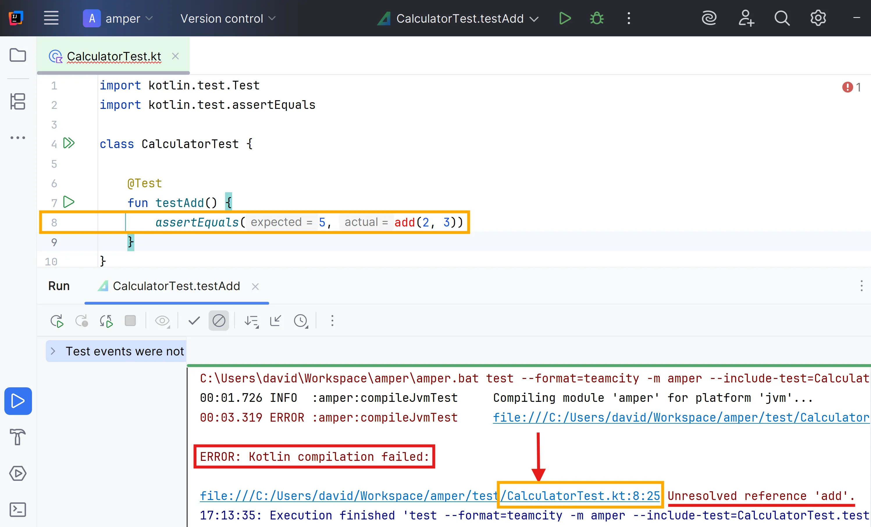 @Test fun testAdd() { assertEquals(5, add(2, 3)) }}Ja sé que la IDE diu que no pot resoldre la referència add i que el primer que penses a fer és crear la funció add, però ara l’objectiu és aprendre a programar quan les coses són molt òbvies.