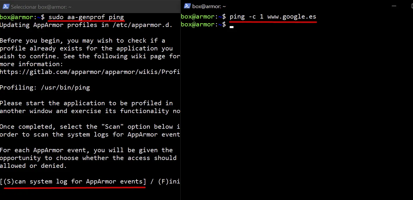 $ sudo aa-genprof pingObre un altre terminal i fes un ping a www.google.es:
