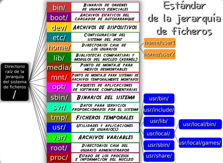 /El directori més alt és el directori arrel que conté tota la resta. Fem servir la barra inclinada per referir-nos a ell.//rootdirectori de l’usuari superadministrador/homeCom hem explicat, els usuaris es troben els directoris personals que pengen de /home/bootdirectori amb informació necessaria per arrencar Linux, no confondre amb/root./devés on hi ha les unitats de discos i particions a Linux (per exemple, en comptes de tenir la unitat C: tindrem/dev/sda). Té moltes altres útilitats avançades./mediaen canvi, els dispositius extraibles (pendrives, imatges ISO de CD/DVD, carpetes compartides …) es creen en aquest directori./binconté els programes essencials del sistema operatiu (per exemple, comandes com mkdir, ls…) Alguns programes del sistema també estan a/sbin./tmp(per a fitxers temporals que no s’han d’emmagatzemar a llarg termini), etc.