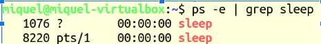 man psPROCESS STATE CODES Here are the different values that the s, stat and state output specifiers (header "STAT" or "S") will display to describe the state of a process: D uninterruptible sleep (usually IO) I Idle kernel thread R running or runnable (on run queue) S interruptible sleep (waiting for an event to complete) T stopped by job control signalSi consultem la llista de processos mentre tenim obert el terminal: