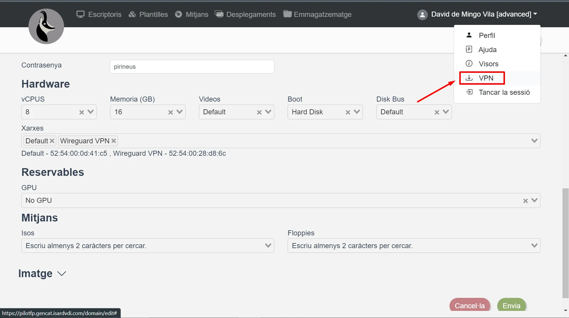 Accedeix al menú desplegable de l’usuari i selecciona l’opció VPN, que descarregarà el fitxer isard-vpn.conf a l’equip amfitrió.