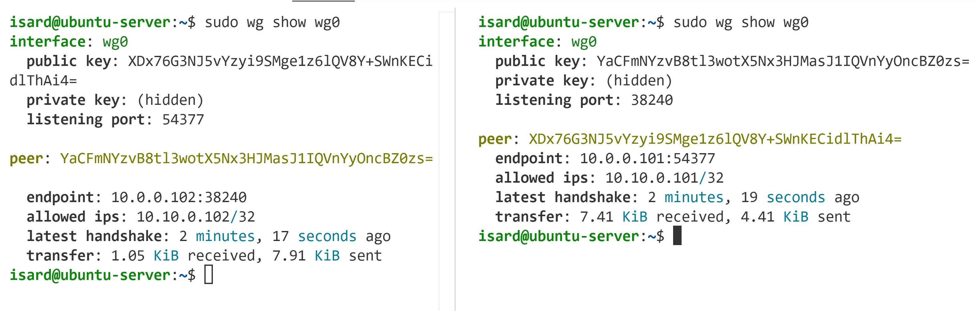 box-1$ sudo wg show wg0interface: wg0 public key: XDx76G3NJ5vYzyi9SMge1z6lQV8Y+SWnKECidlThAi4= private key: (hidden) listening port: 54377
