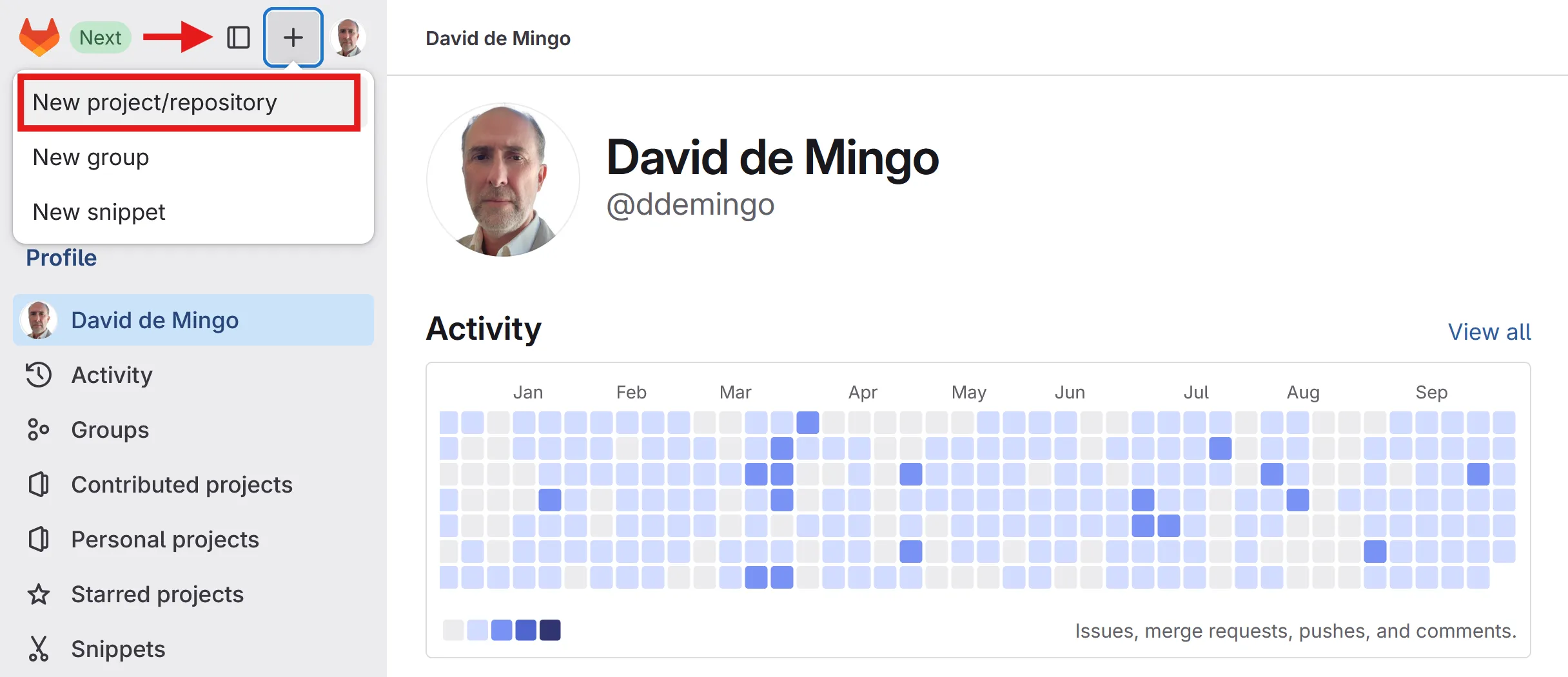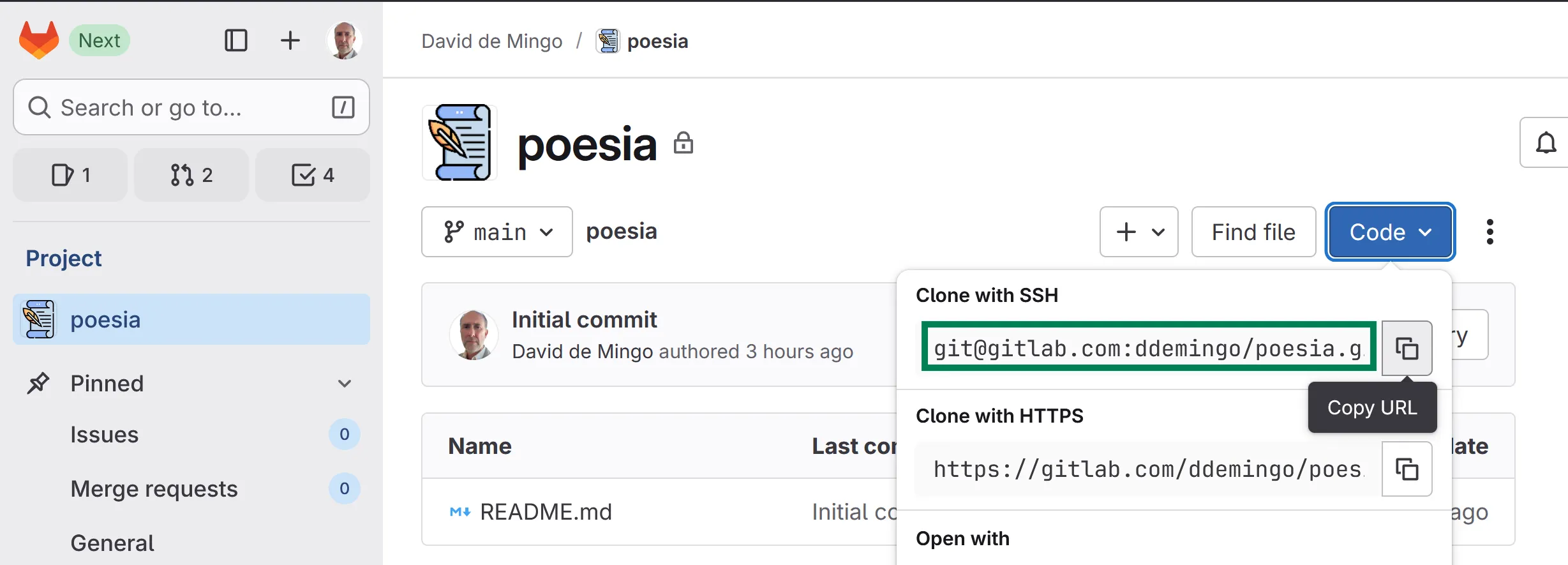 git clone git@gitlab.com:ddemingo/poesia.gitCloning into 'poesia'...remote: Enumerating objects: 3, done.remote: Counting objects: 100% (3/3), done.remote: Compressing objects: 100% (2/2), done.remote: Total 3 (delta 0), reused 0 (delta 0), pack-reused 0 (from 0)Receiving objects: 100% (3/3), done.Ja pots escriure la primera estrofa de la teva primera poesia: