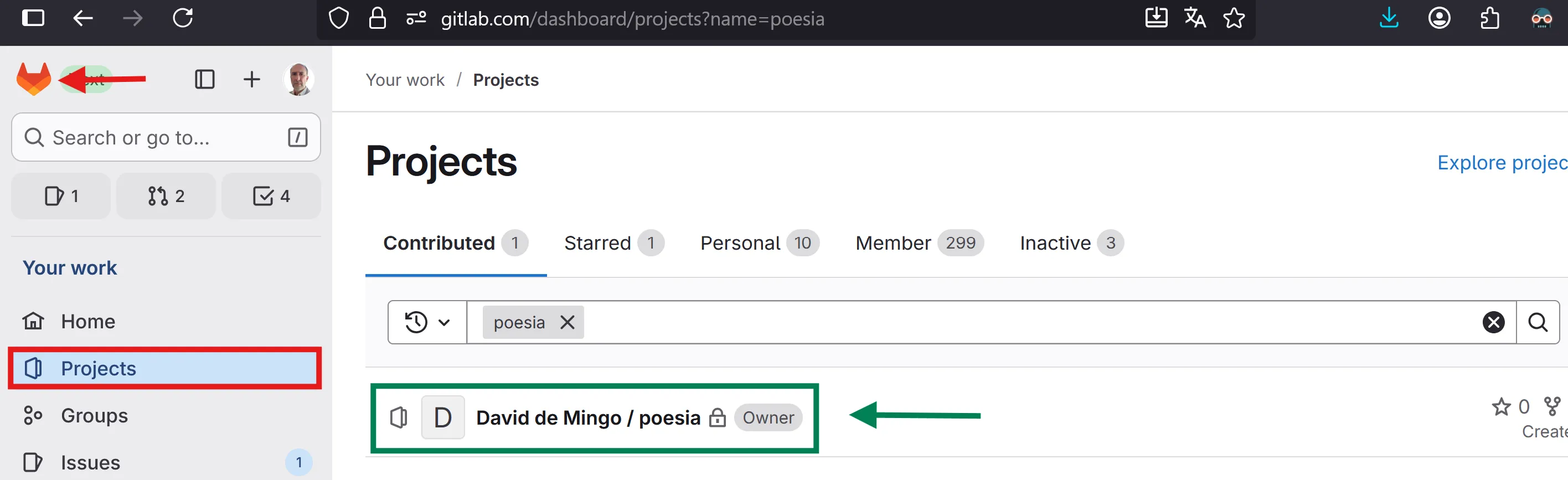 git remote -vorigin git@gitlab.com:ddemingo/poesia.git (fetch)origin git@gitlab.com:ddemingo/poesia.git (push)A continuació actualitza els teus commits al repositori remot de Gitlab: