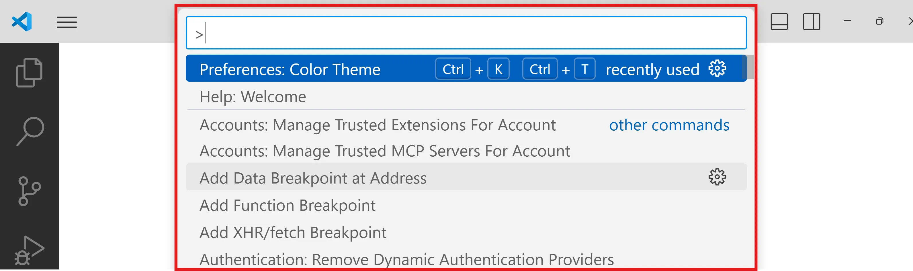 Visual Studio Code proporciona accés a totes les comandes disponibles a través de la Paleta de comandes, i moltes d’aquestes comandes no estan disponibles mitjançant menús o altres elements de la interfície. Des de la Paleta de comandes, pots executar ordres per dur a terme tasques de l’editor, a més de comandes d’extensions.