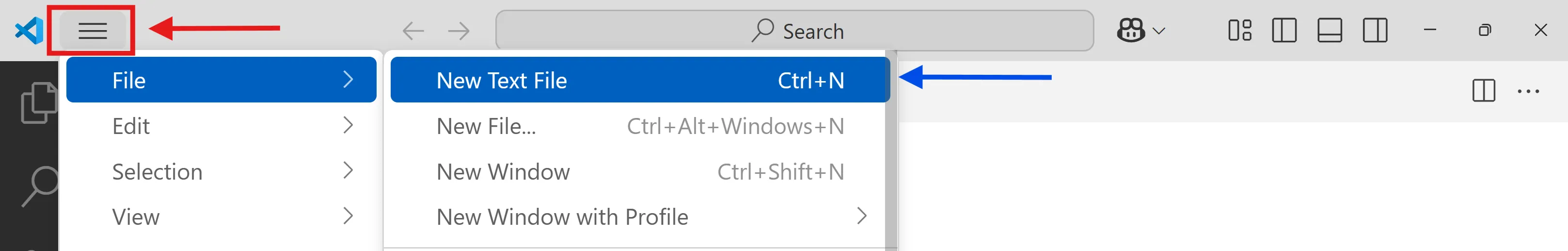 Crea un fitxer des del menú d’opcions de VS Code, seleccionar File > New Text File (o la drecera Ctrl + N).