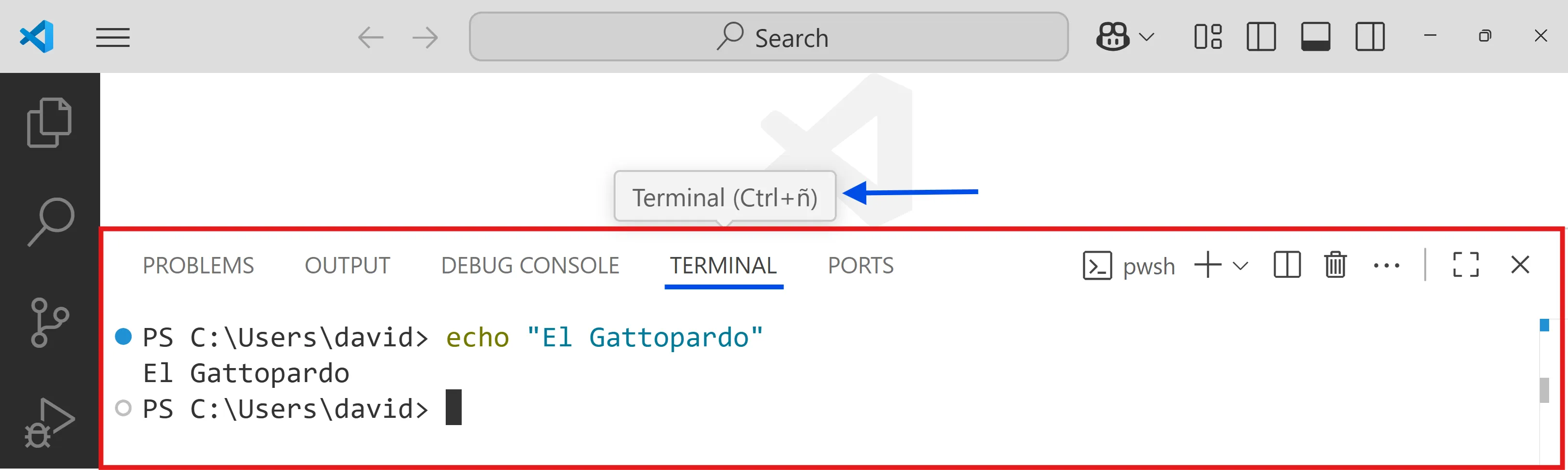 També pots obrir el terminal integrat a la zona de Panells. El terminal integrat proporciona una interfície de línia d’ordres per al teu sistema operatiu.