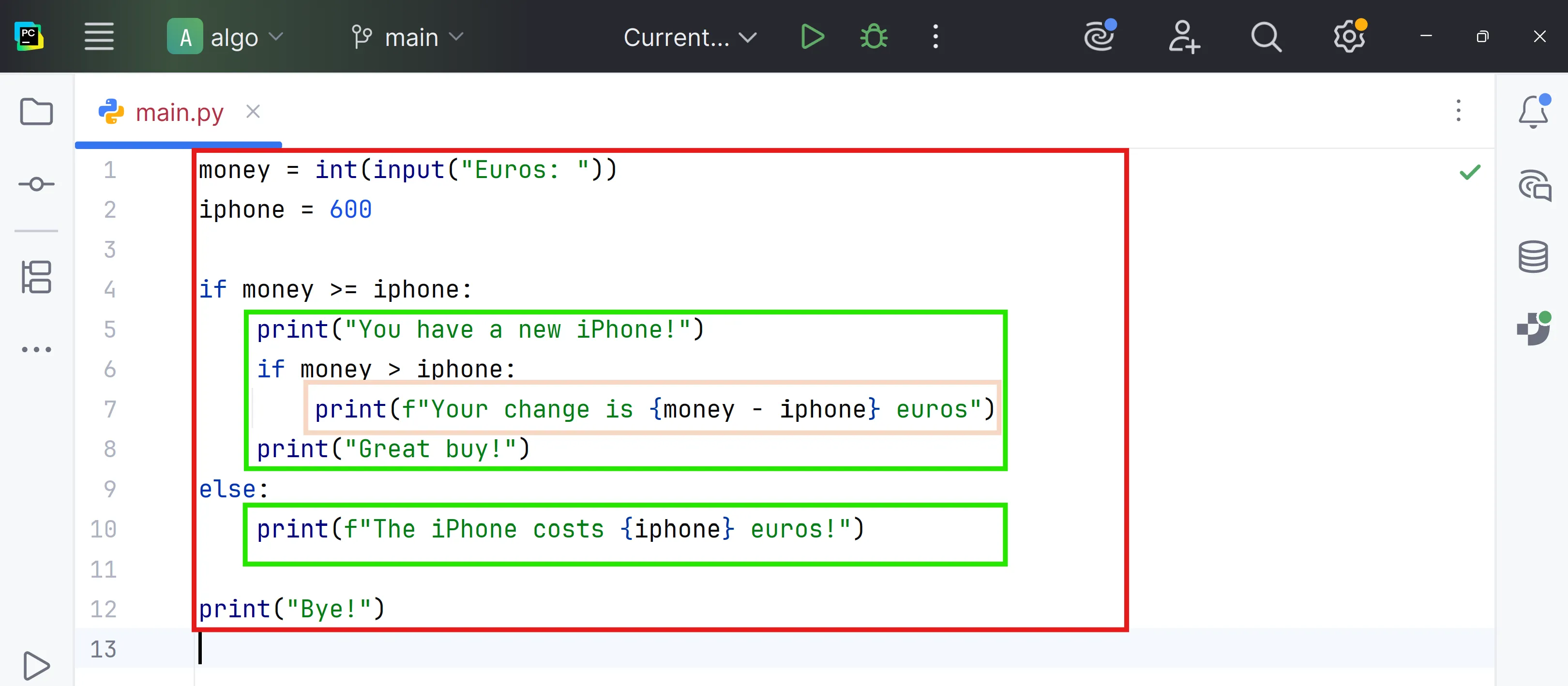 if money >= iphone: print("You have a new iPhone!") if money > iphone: print(f"Your change is {money - iphone} euros") print("Great buy!")else: print(f"The iPhone costs {iphone} euros!")