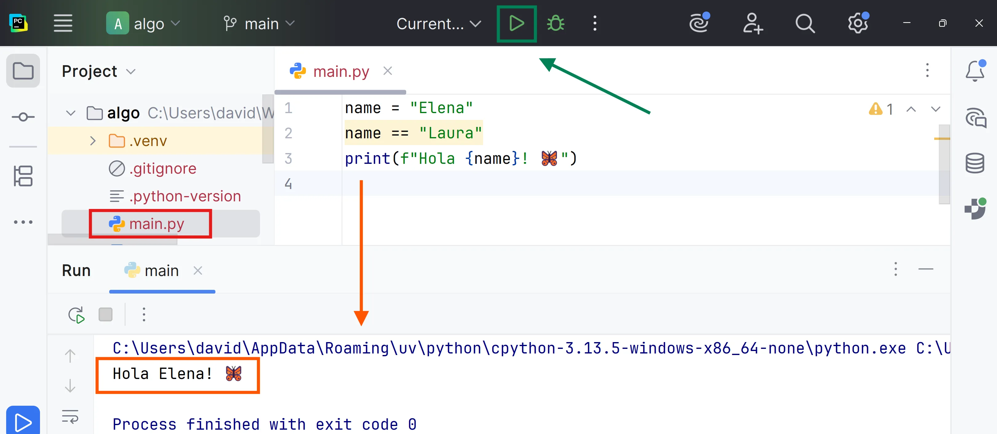 name = "Elena"name == "Laura"print(f"Hola {name}! 🦋")print("👻")Executa el codi:
