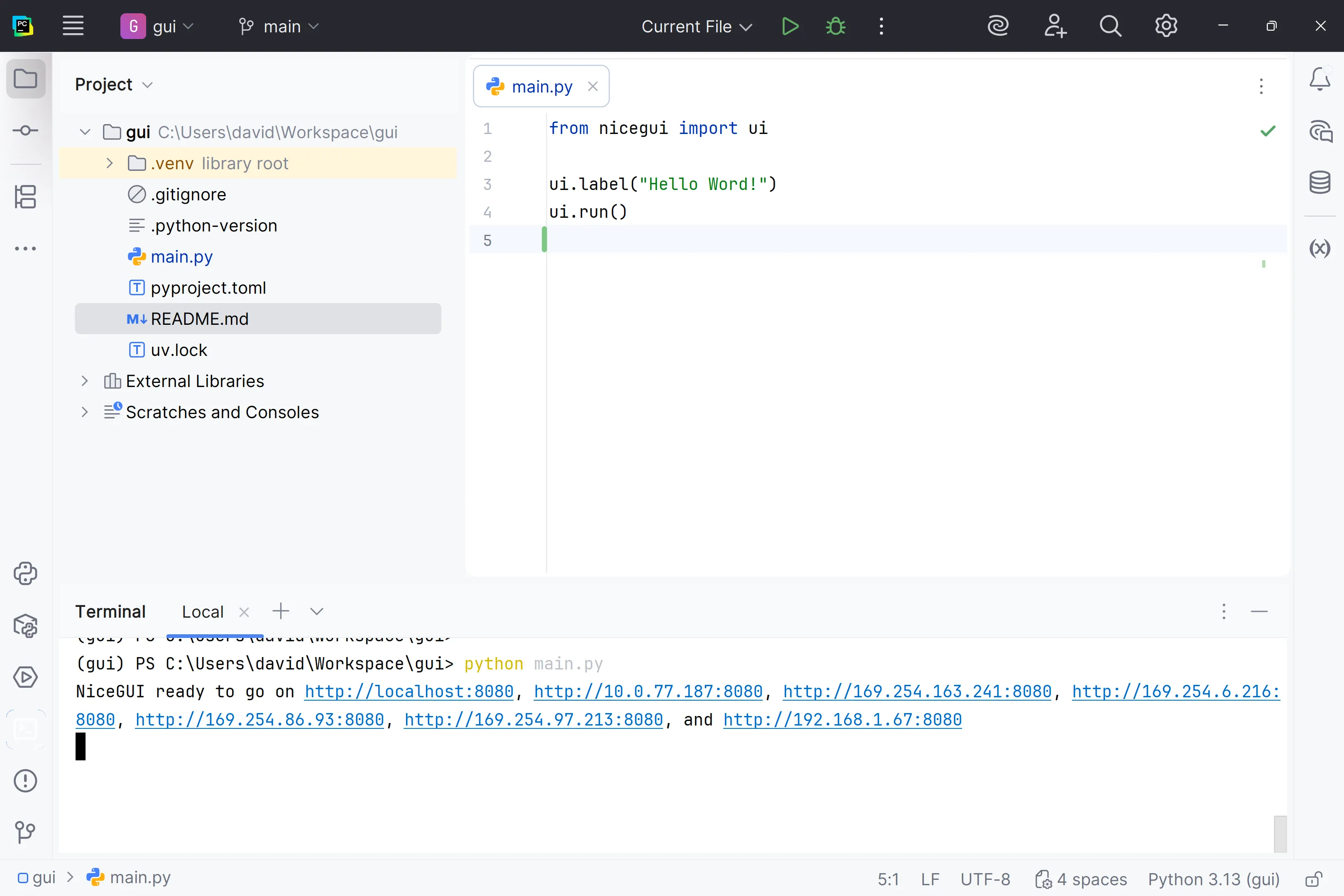 ui.label('Hello World!')ui.run()Executa el projecte: