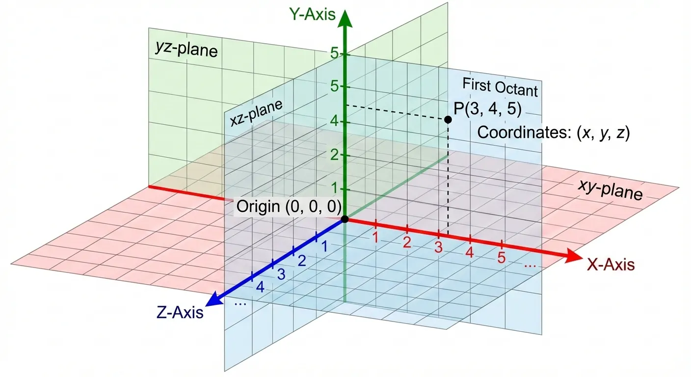 • Coordinate Planes. The grid lines form three coordinate planes: the xy-plane, the yz-plane, and the xz-plane. These planes divide the space into eight octants, which are analogous to the four quadrants of a two-dimensional coordinate system.
