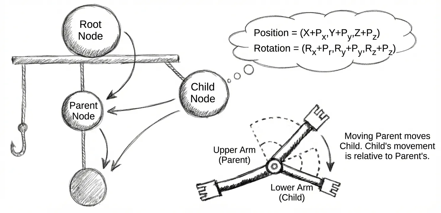 You can think of it as being a bit like the arm of an articulated figurine: moving the lower arm results in effectively no change to the upper arm. However, moving the upper arm results in the lower arm being moved accordingly. Furthermore, if the upper arm is rotated to point upwards, the lower arm likewise points up, and any rotations of the lower arm are relative to that orientation.