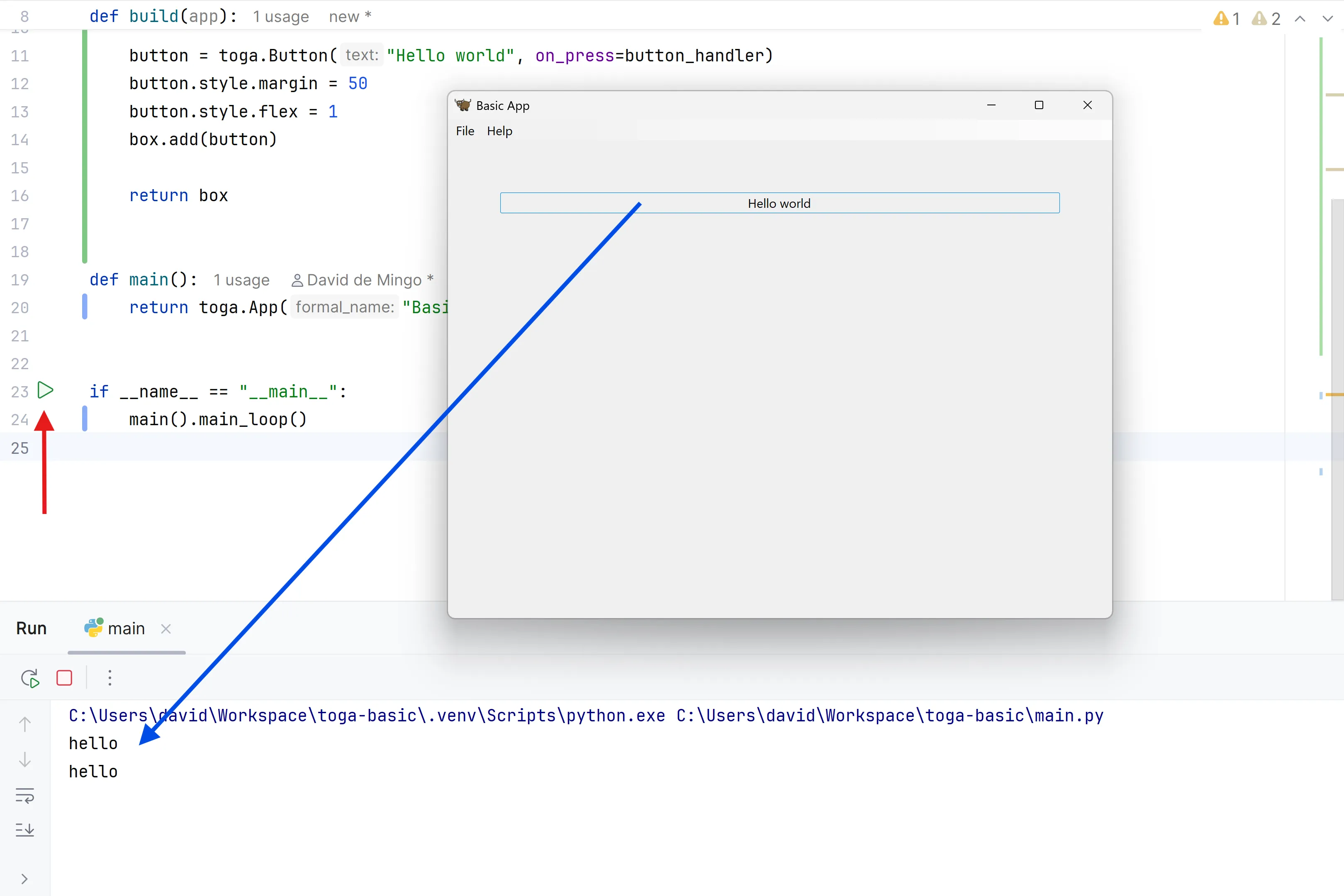 import togaThen we set up a handler, which is a wrapper around behavior that we want to activate when the button is pressed. A handler is just a function. The function takes the widget that was activated as the first argument; depending on the type of event that is being handled, other arguments may also be provided. In the case of a simple button press, however, there are no extra arguments: