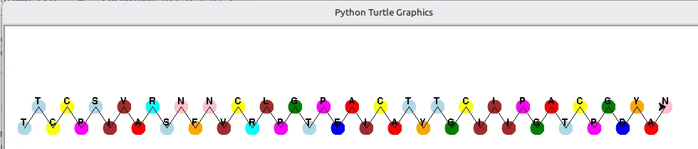 • For each color, change the turtle’s fill color, draw a filled circle (the amino acid bead), and then move the turtle forward.
