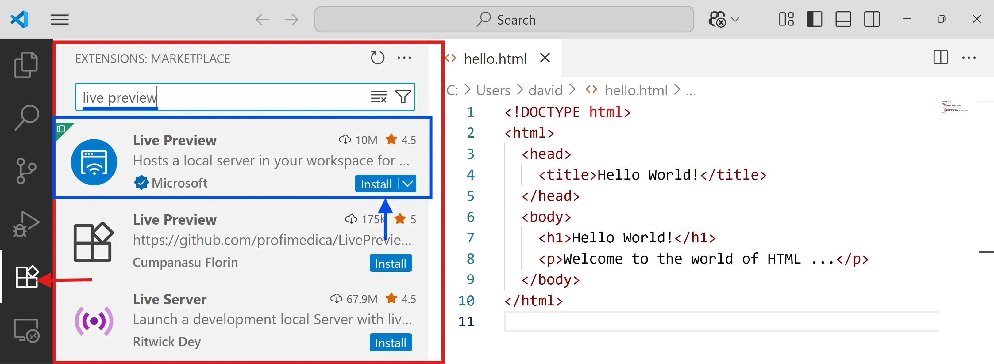 Instal·la l’extensió Live Preview (Microsoft) que et permet visualitzar el document en el mateix editor amb un navegador integrat: